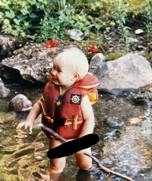 life jacket2 Published June 6, 2021 at 500 × 596 in New Roof Old Photos… Paddling in the lake with permanent life-jacket. (had to censor this!)