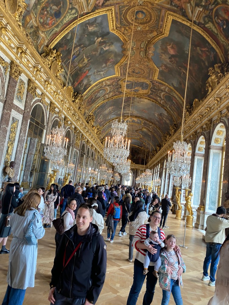 On our final day in Paris The Man and I went to visit Versailles. It was something I had always wanted to do. But, what a disappointment. We had booked tickets for 1pm and it was decided that we would not take the children with us this time so my daughter stayed back at our apartment and had a chilled day with them. This was absolutely the right decision. We travelled to Versailles on the metro which I have to say was easy and very reasonably priced. When we arrived there was still a very long queue for 12 noon entry which was a little off-putting. However we lined up with others at the 1pm sign and eventually moved in through security at around 1.45. It was extremely busy, like the worst kind of rush hour. I discovered later that Versailles has an average of 27,000 visitors A DAY!! Which is equivalent to more than 3,000 an hour. I mean, it’s unpleasant and frankly not safe at all. The rooms are quite small so you are herded through. There are lots of paintings on the wall, Louis this and Louis that and queens and kings and another Louis…you see where I’m coming from? Not many rooms are furnished so no ‘feeling’ of what it was like to live there back in the day. The Hall of Mirrors, the most famous room in the palace was all right, but not spectacular, I expected to be blown away but I wasn’t. The crystal chandeliers were . . . okay.