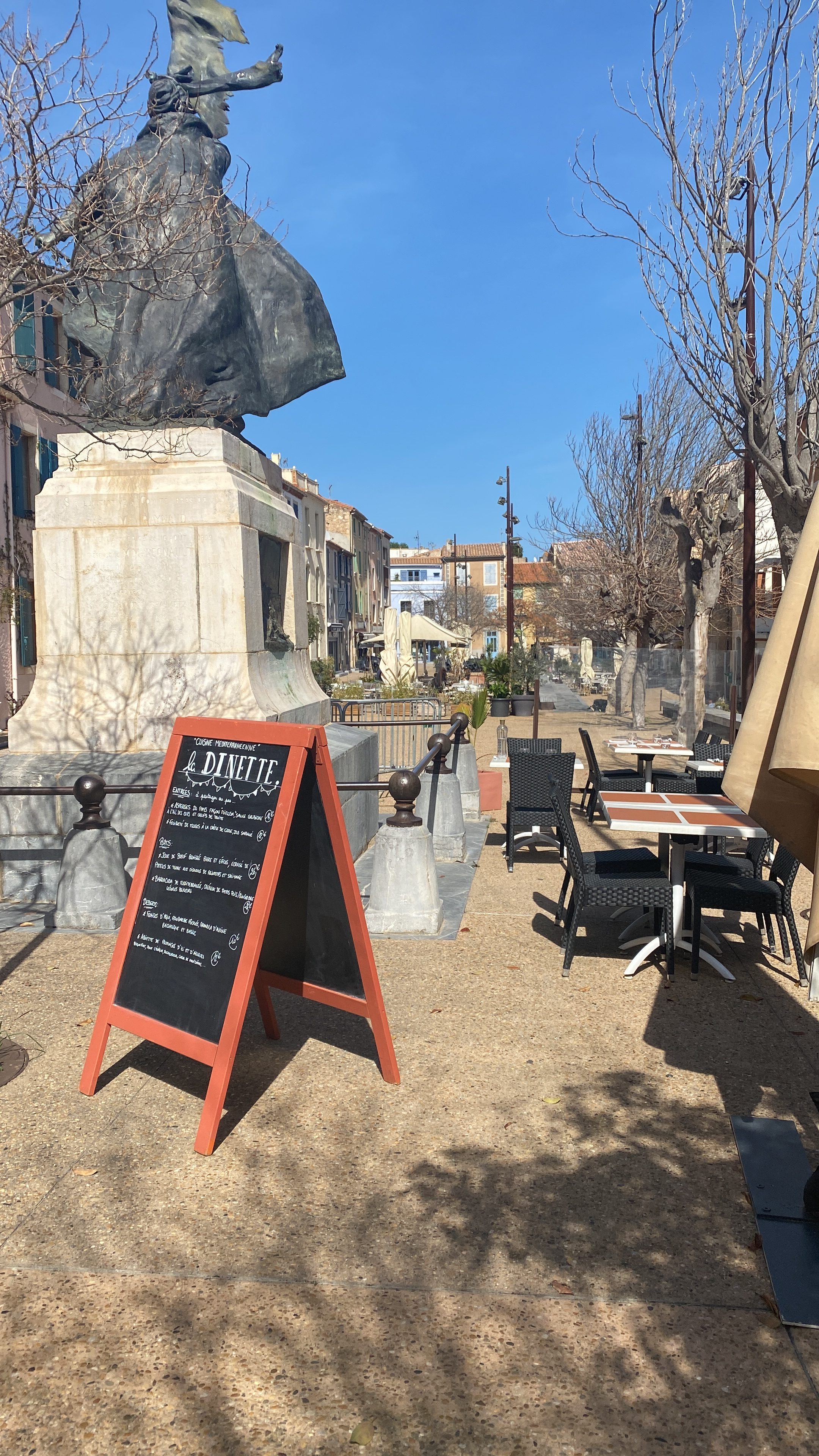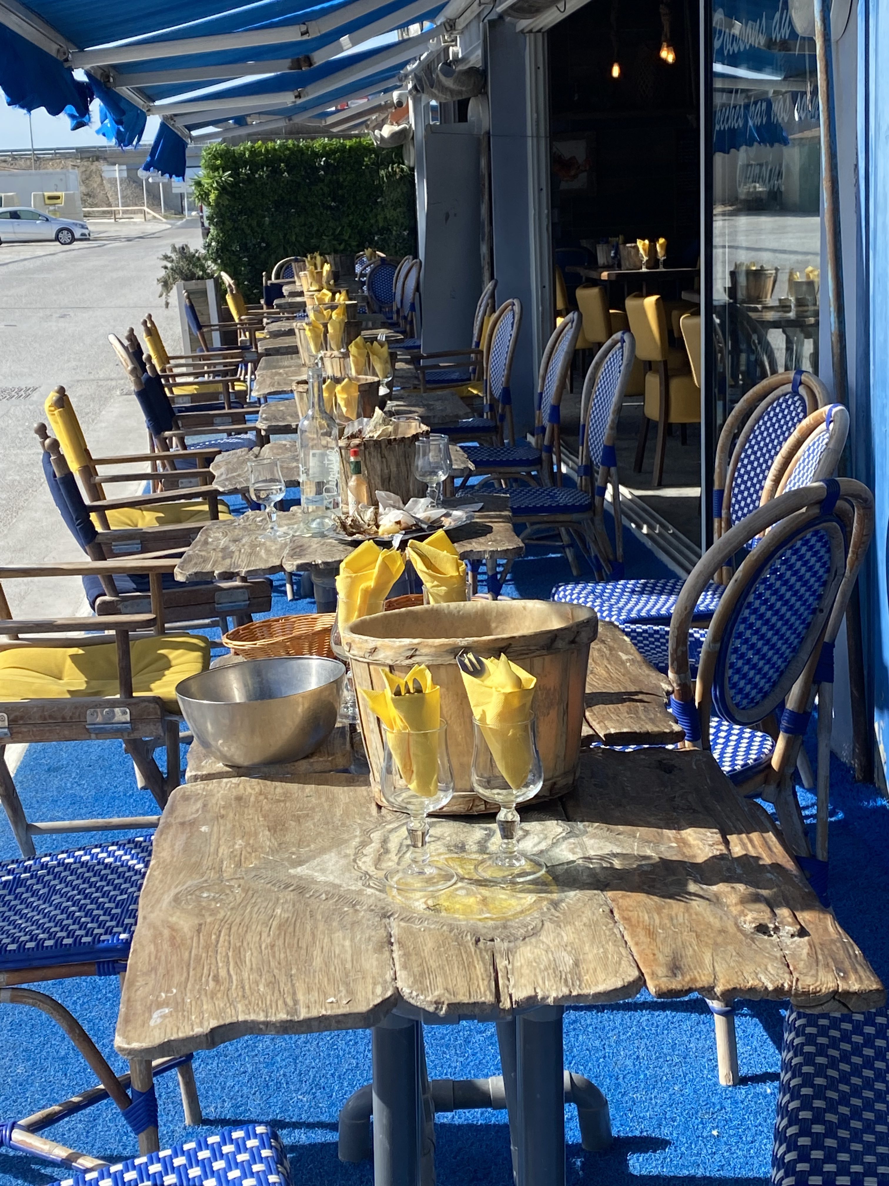 After downing the coffee we then thought we would head to the port further down the coast. It was a working port and bereft of restaurants (we were ready for lunch by then). We looked on the map and found a cluster of restaurants just a short drive away. We chose Le Bistrot des Copains, and when we arrived there it was beside the Marina so we were able to eat our excellent lunch, outside, right beside the beautiful yachts and boats. Lovely and exactly what I’d imagined when lying in bed in the morning thinking about our day out. Result!