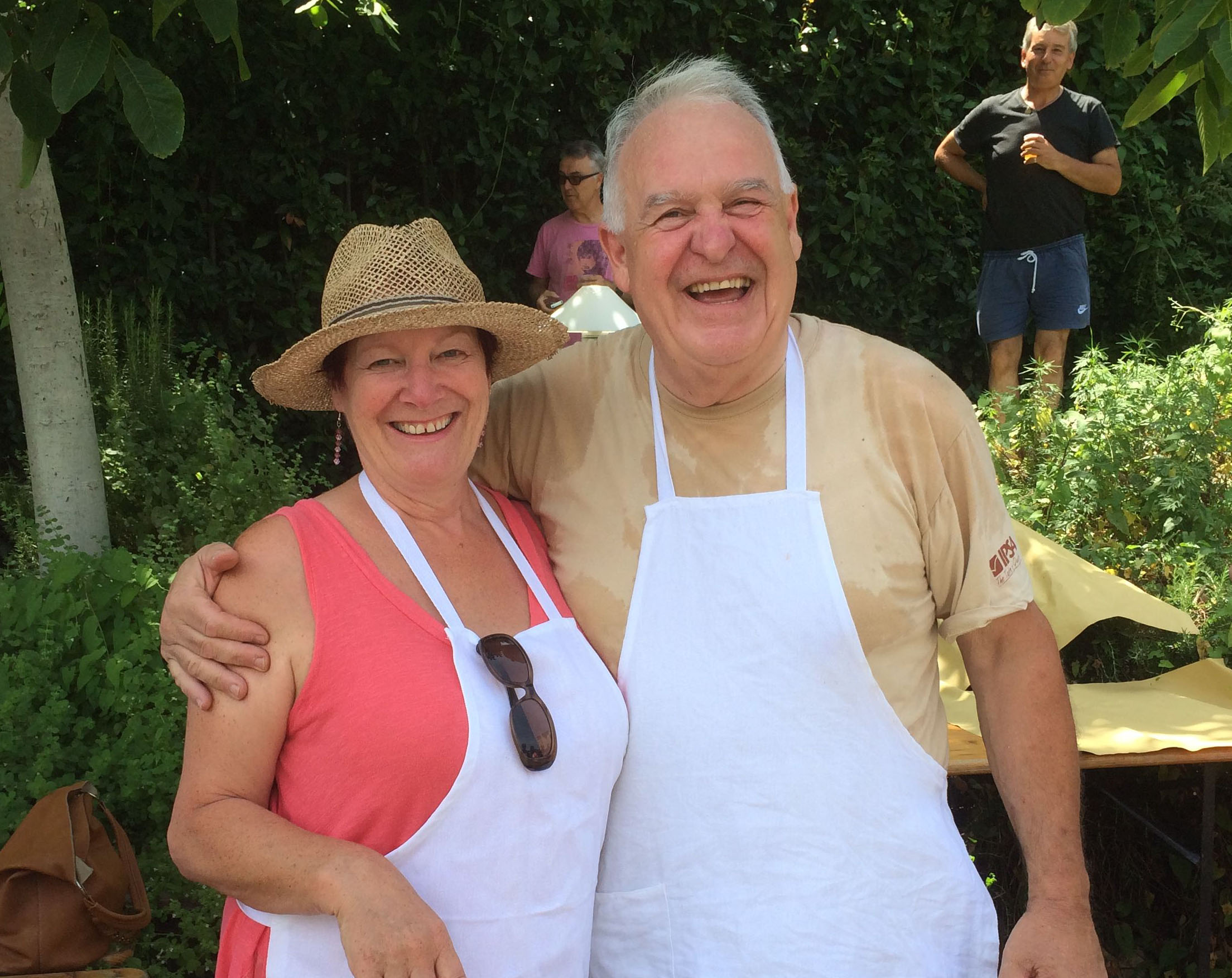 Twenty-four people sat down to eat after the demonstration. Roberto prepared a feast for us, it was a completely vegetarian meal and even though the majority of the guests were carnivorous I never heard one complaint. In fact the opposite was the case. We had a small taste of the pasta prepared by our friends, followed by a massive plate a pasta that had been made earlier. The tomato sauce served with it was simple but delicious, wild celery was detected, I understood it to be a herb, quite distinctive. Roberto is a keen herb grower and can easily identify any wild herbs growing in the fields. I’ve often seen him out with his carrier bag searching and collecting. The next dish on the menu was a fabulous ratatouille with potatoes, peppers, aubergines, tomatoes and herbs. Roberto is a very good cook.